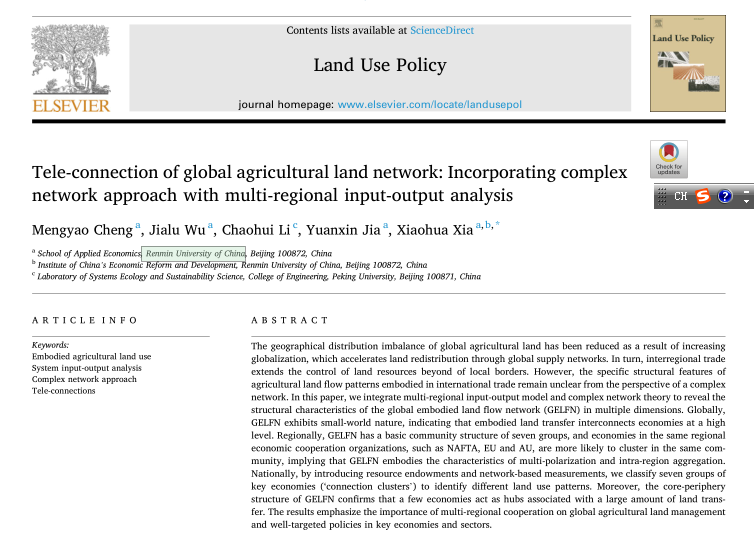 Dr. Xiaohua Xia recently had a paper published in the Land Use Policy. The paper titled‘Tele-connection of global agricultural land network: Incorporating complex network approach with multi-regional input-output analysis’, was coauthored with Mengyao Cheng,Jialu Wu and Yuanxin Jia from School of Ap...