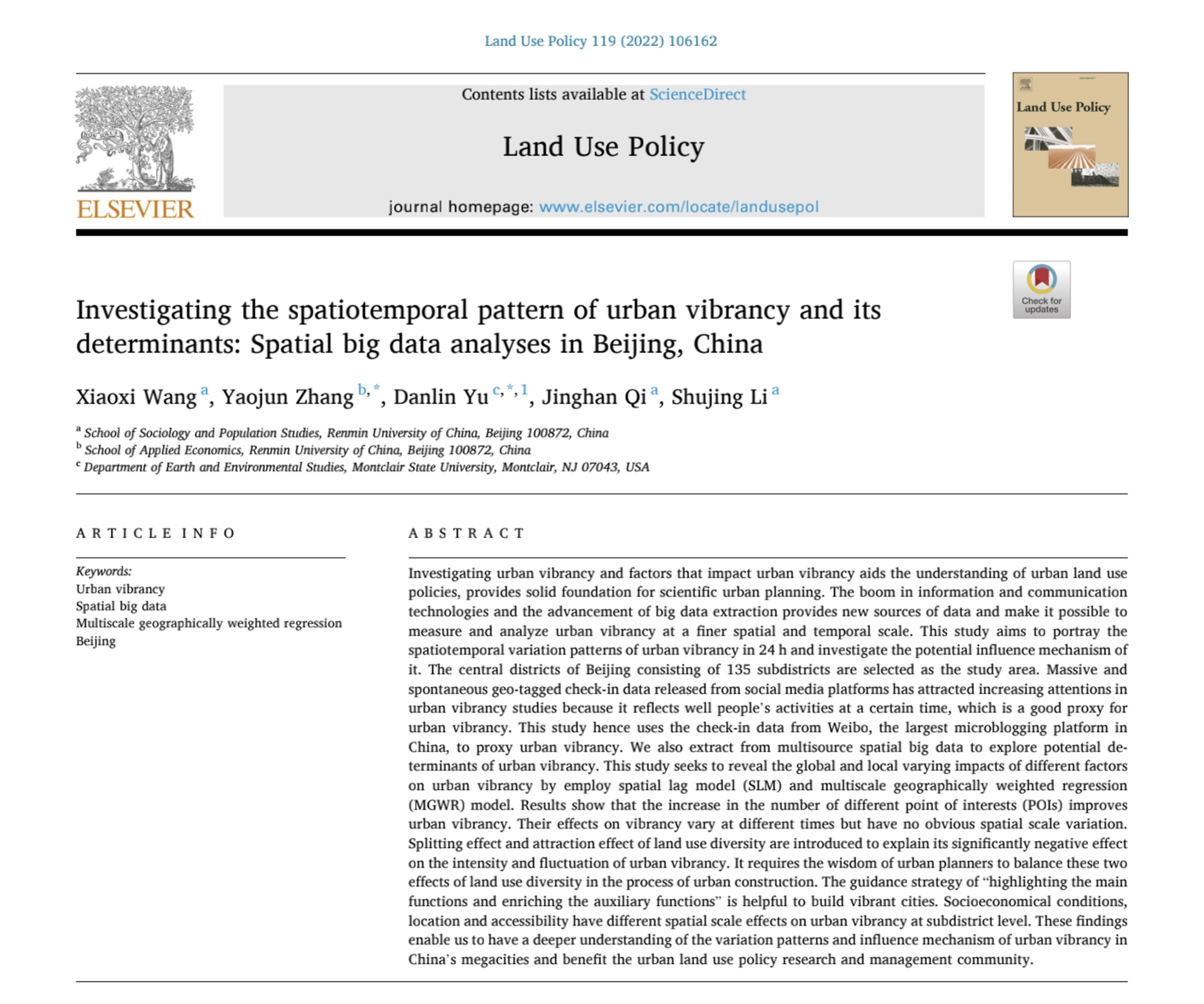 Dr. Yaojun Zhang recently had a paper published in the Land Use Policy. The paper titled‘Investigating the spatiotemporal pattern of urban vibrancy and its determinants: Spatial big data analyses in Beijing, China’, was coauthored with Xiaoxi Wang,Jinhan Qi and Shujing Li from School of Sociology and Population Studies, Renmin University of China, Danlin Yu from Department of Earth and Environmental Studies, Montclair State University.