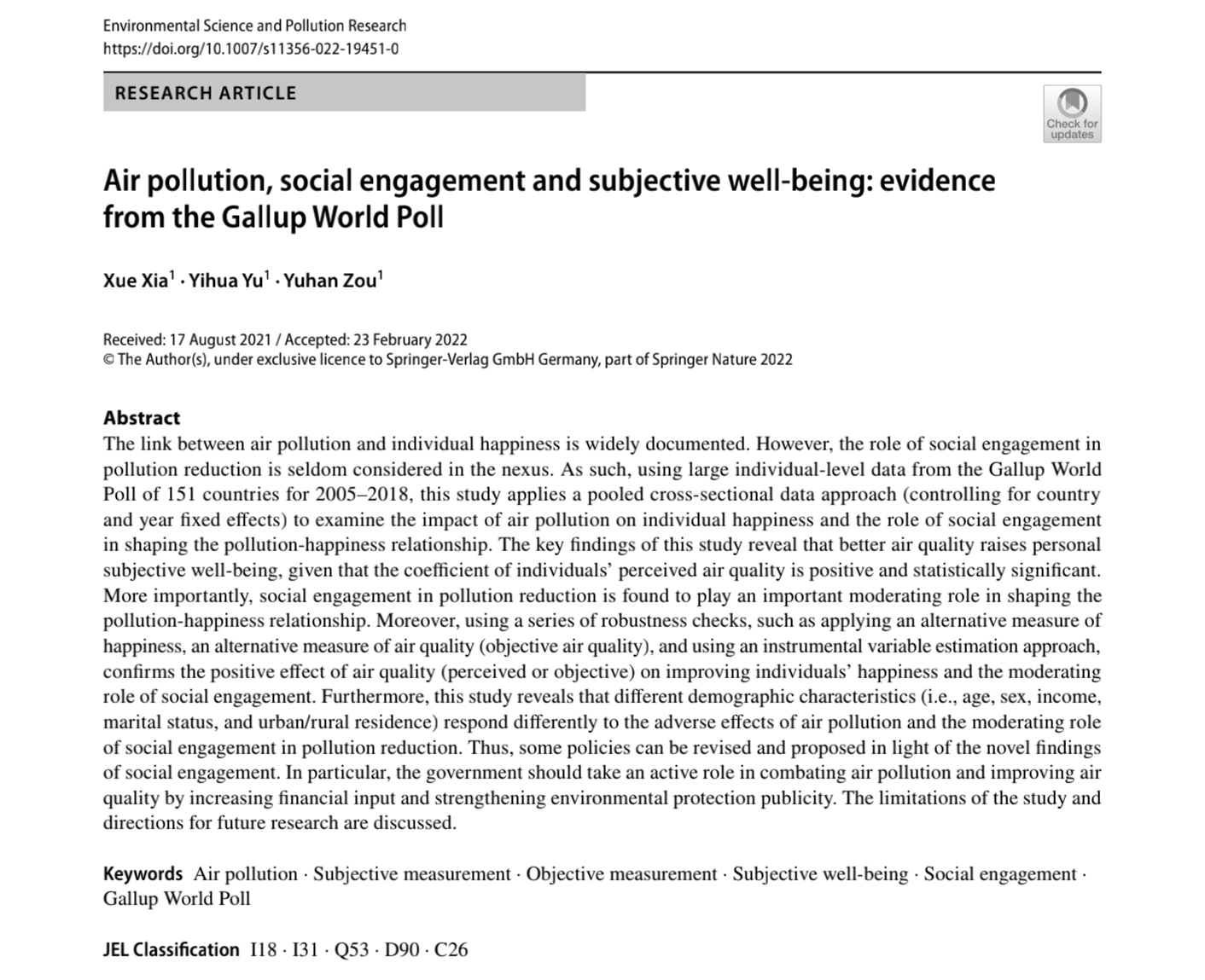 The link between air pollution and individual happiness is widely documented. However, the role of social engagement in pollution reduction is seldom considered in the nex...